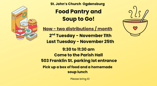 If you do not have a church home and would like to make St. John’s your parish of choice; or have a need our church family can help with, please contact our Parish Administrator, Jeannette, at the church office (315) 393-5470
